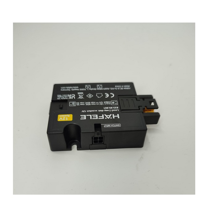 Dystrybutor 833.95.901 HAFELE LOOX5 z funkcją przełączania do dwóch wejść. Wyposażony został w połączenie wtykowe typu BOX-TO-BOX. Napięcie dystrybutora wynosi 12V. Maksymalna moc podłączonych urządzeń wynosi 60W - nie zaleca się przekraczania maksymalnej mocy wyjściowej zasilacza!