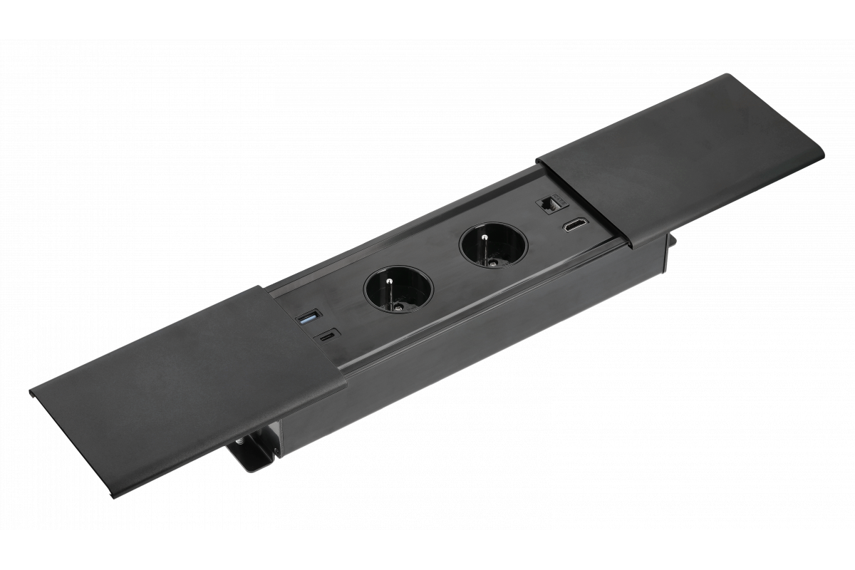 Praktyczny i elegancki design gniazda podnosi komfort naszej pracy. Prestino posiada przesuwaną przesłonę domykaną magnesem, która chroni przed wilgocią i zabrudzeniami. Gniazdo ma bardzo niski profil, tworząc z blatem niemal gładką powierzchnię. Idealny do blatów w biurach, salach konferencyjnych, salonach, sklepach i hotelach. Sprawdzi się wszędzie tam, gdzie zależy nam na estetycznym otoczeniu. Trzy kolory wykończenia: biel, czerń i aluminium – świetnie będą się komponować z biurkami w czerni, szarości i brązach, stanowiąc element wyposażenia biurka.