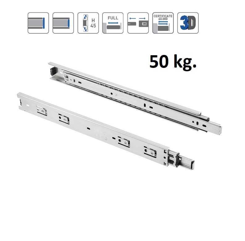 Uniwersalna prowadnica kulkowa do szuflad drewnianych, sprawdzi się w wielu typach mebli, zarówno do szafek kuchennych jak i łazienkowych, do wyposażenia mebli w salonie, sypialni i garderobie. Wersja PRO została dodatkowo wzmocniona dzięki czemu maksymalne obciążenie wynosi 50kg. Pełny wysuw prowadnicy gwarantuje łatwy dostęp do głębiej schowanych rzeczy, a solidna budowa zapewnia długie i przyjemne użytkowanie.