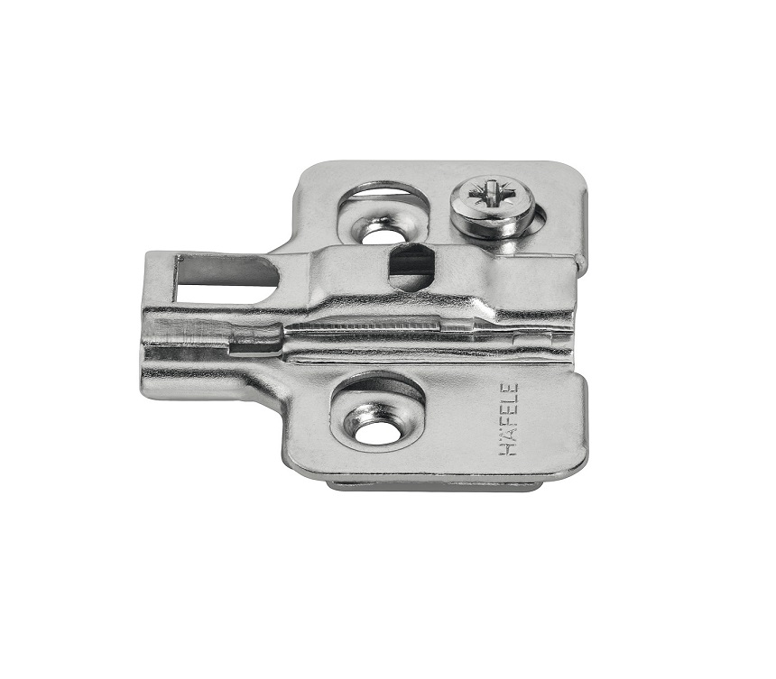 Prowadnik krzyżakowy Häfele Metalla 310 SM z techniką szybkiego montażu, regulacja wysokości ±2 mm na mimośrodzie do przykręcania wkrętami do płyt wiórowych.