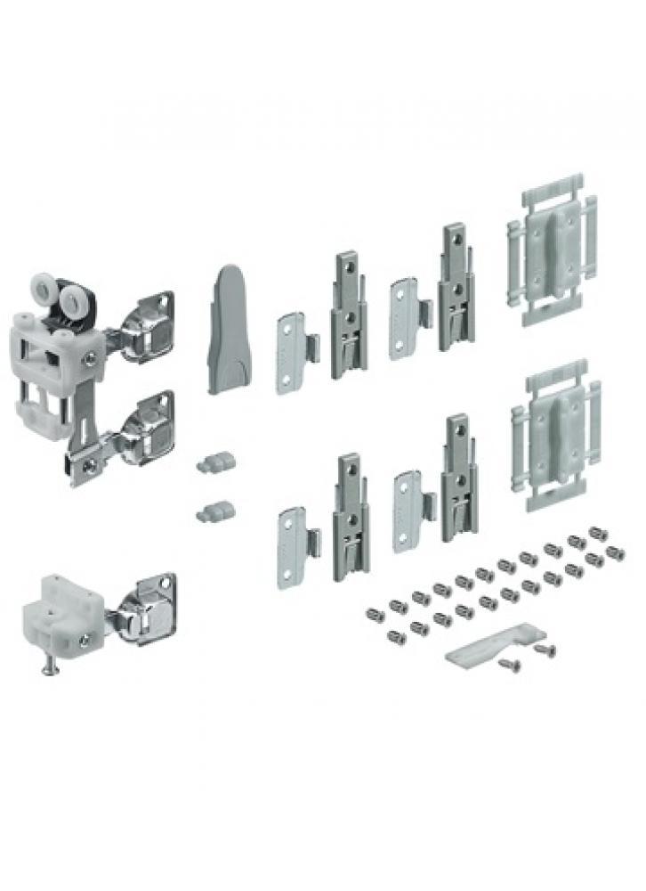 • Zestaw okuć zawiera wszystkie niezbędne elementy do 1 drzwi składanych 2-skrzydłowych