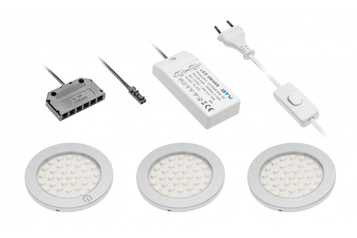 Zestaw składa się z trzech opraw i wszystkich niezbędnych akcesoriów potrzebnych do prawidłowego działania (zasilacz, dystrybutor, przewód sieciowy). Nie ma konieczności podłączania dodatkowego włącznika ponieważ jest on wbudowany w oprawę.