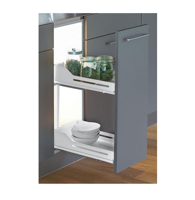 Snello Libell to wysuwane cargo z dwoma półkami. Cargo to jest systemem perfekcyjnie odnajdującym się we wnętrzu małej szafki kuchennej umiejscowionej tuż przy zlewie lub kuchence. Idealnie nadają się do montowania w 200 mm przestrzeni w meblach kuchennych, które mogłyby być zaślepione i tym samym zmarnowane.