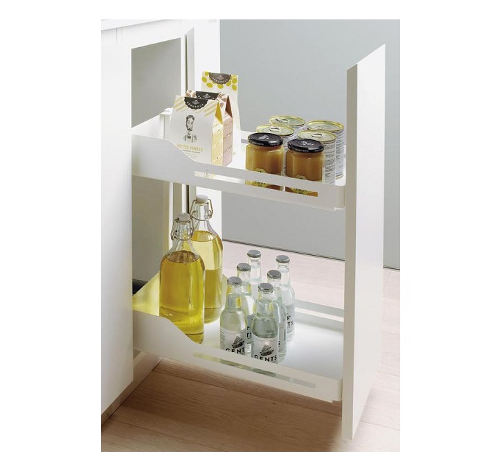 Snello Libell to system „wysuwanych półek”, jest mechanizmem perfekcyjnie odnajdującym się we wnętrzu małej szafki kuchennej umiejscowionej tuż przy zlewie lub kuchence. Idealnie nadają się do montowania w 300 mm przestrzeni w meblach kuchennych, które mogłyby być zaślepione i tym samym zmarnowane.