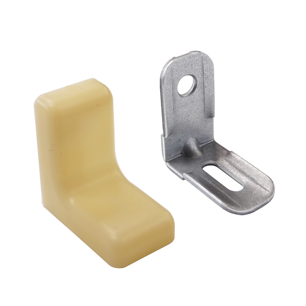 Metalowe złącze montażowe  z estetycznym wykończeniem z tworzywa sztucznego w kolorze klon. Przeznaczony do wzmacniania konstrukcji stolarskich. Pozwala na łączenie płyt meblowych pod kątem prostym.