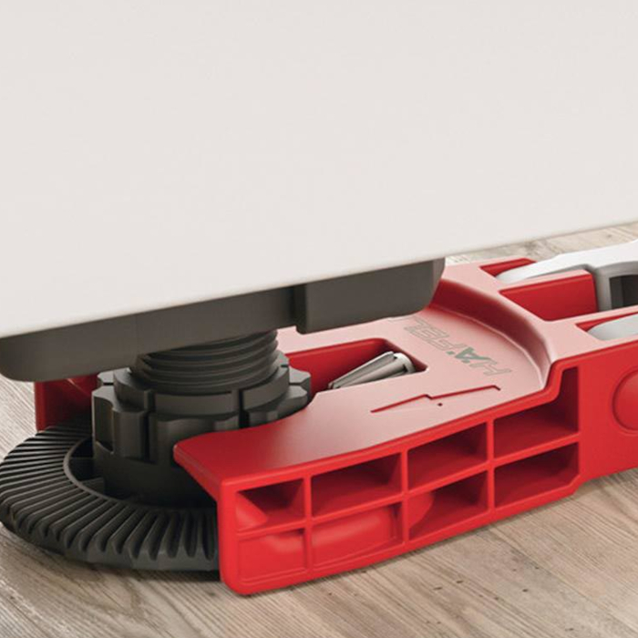 Narzędzie firmy Hafele to produkt ułatwiający regulowanie nóżek Axilo. Można obsługiwać je ręcznie lub za pomocą wkrętarki. Pozwala na jednoczesne regulowanie nóżek i obserwację poziomicy. Można je stosować pod różnym katem. Ułatwia regulację nóżek szczególnie tych położonych w głębi korpusu (np. szafki narożne). Zaoszczędza czas na montażu u klienta i dodatkowo ułatwia pracę.