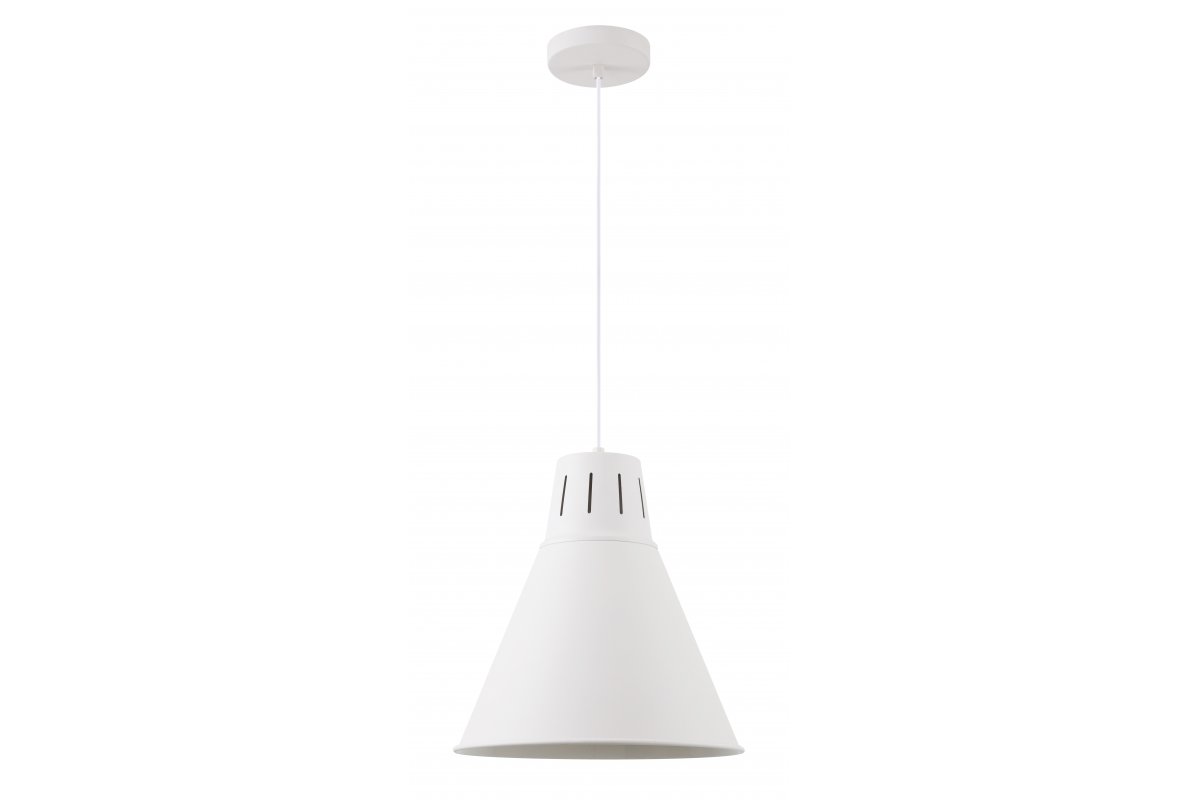 Wariant z białym kloszem i białym mocowaniem jest niezwykle delikatny i może być wykorzystany w każdym pomieszczeniu. Klosz o średnicy 32 cm zawieszony jest na regulowanym przewodzie. Takie rozwiązanie docenią w szczególności właściciele niezbyt wysokich lokali.