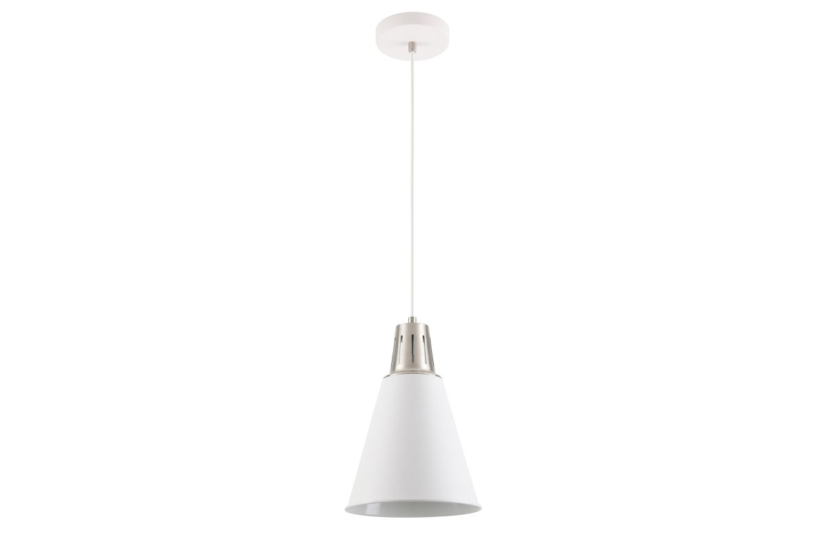 Wariant z białym kloszem i mocowaniem ze szczotkowanej stali może być wykorzystany w każdym pomieszczeniu. Klosz o średnicy 22 cm zawieszony jest na regulowanym przewodzie. Takie rozwiązanie docenią w szczególności właściciele niezbyt wysokich lokali.