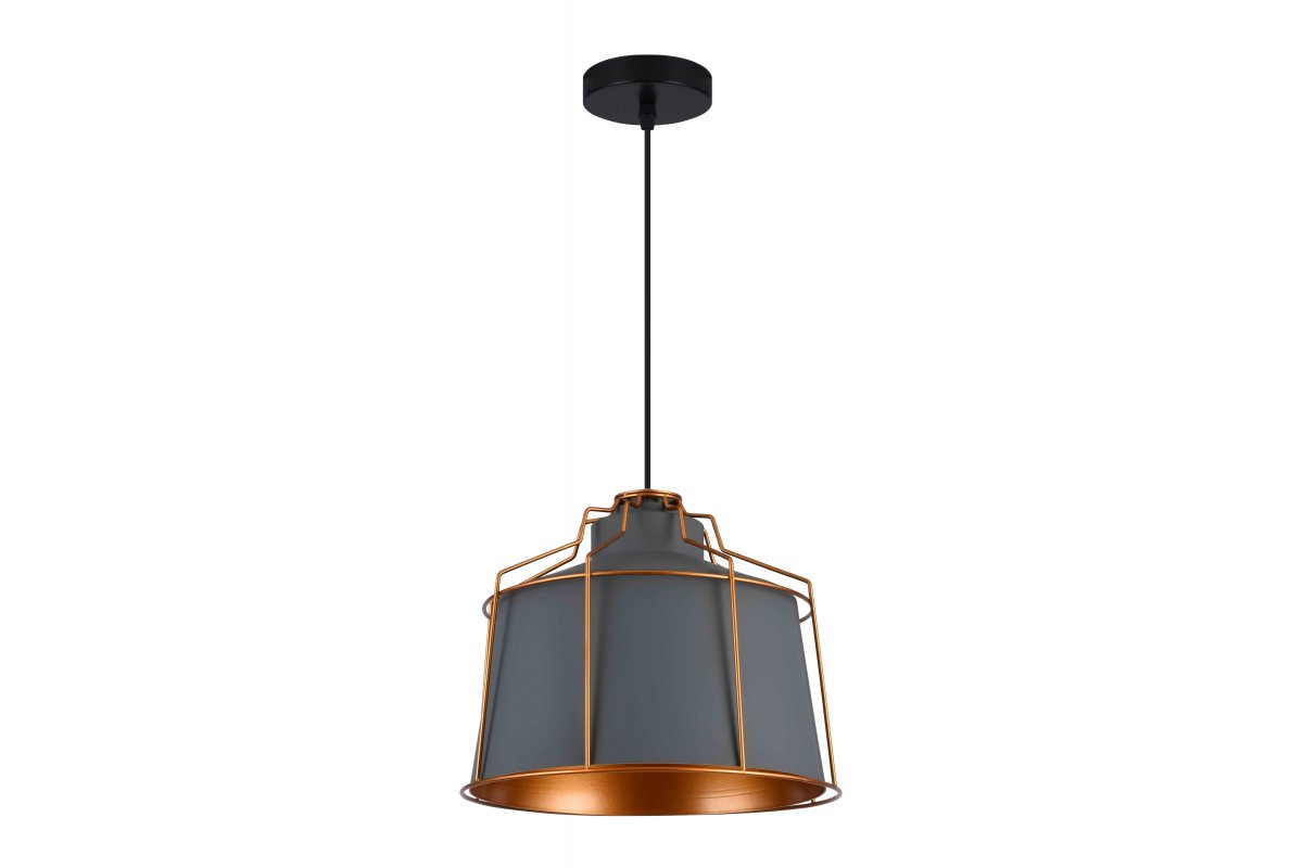 Efektowny wygląd tej lampy został zbudowany na zasadzie kontrastów. Klasyczny, lekko rozszerzający się ku dołowi, szary klosz okryty jest ozdobnym złotym stelażem