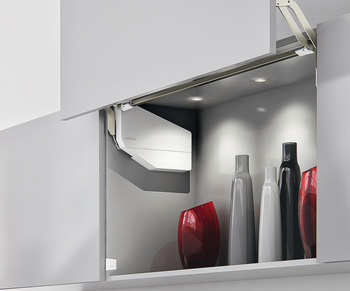 Free up to podnośnik, który idealnie sprawdzi się w korpusach z frontami nakładanymi. Minimalna siła potrzebna do otwarcia, funkcja zatrzymania w każdej pozycji i amortyzacja w kierunku otwierania i zamykania zapewniają wyjątkową jakość obsługi. Efektywny i sprawny montaż dzięki kołkom ustalającym, fabrycznie zamontowanym wkrętom euro, technice szybkiego montażu przy froncie i poprzecznicy oraz regulacji mimośrodowej frontu
