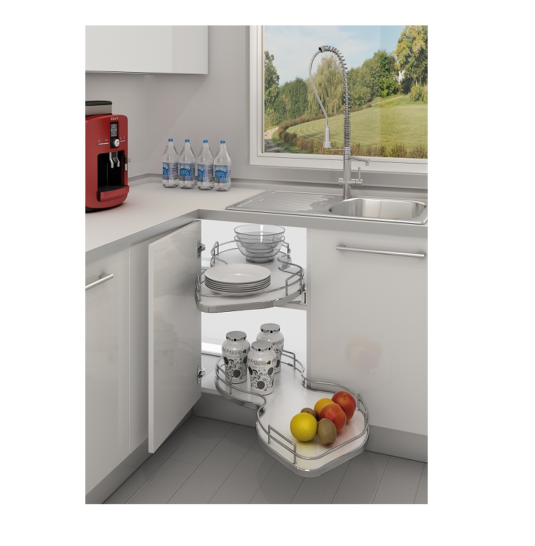 Półki narożne Hafele Nuvola+ montowane na półce w szafce narożnej świetnie sprawdzą się jako element doposażający nowoczesną kuchnię. Wysuwana na szynie prowadzącej gwarantuje stabilne i wytrzymałe działanie. Udźwig do 20 kg na półkę pozwala na przetrzymywanie na półce nawet ciężkich rzeczy. Półki Nuvola+ można nabyć wersji pojedynczej co pozwala na łączenie rozwiązań wewnątrz szafki narożnej. Sige