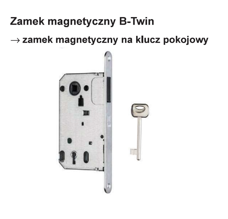Zamek magnetyczny B-TWIN do drzwi wewnętrznych, w wersji na klucz pokojowy, z blachą czołową zamka wykończoną w kolorze chrom polerowany.