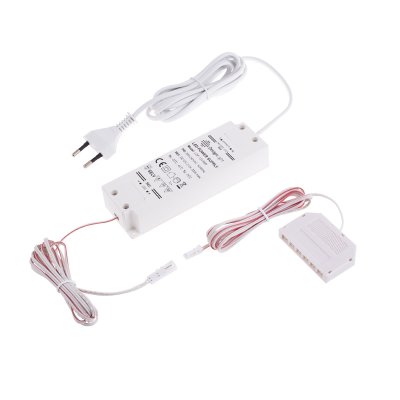 UKŁAD ZASILAJĄCY do LED 33W  z rozdzielaczem 6-pkt zasilany jest napięciem przemiennym o wartości 200-240V~50/60Hz. Obniża napięcie wyjściowe do 12V DC. Zamknięty jest w obudowie izolacyjnej z tworzywa sztucznego w kolorze białym.