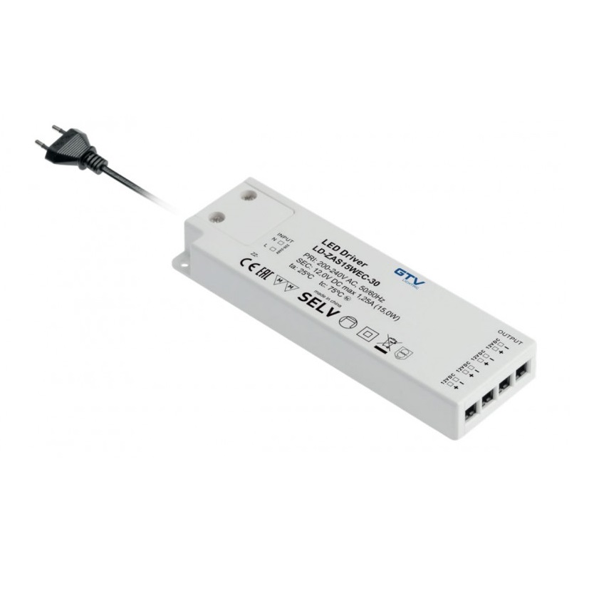 Zasilacz GTV SLIM EASY CLICK 12V wbudowane gniazda miniAMP do bezpośredniego podłączenia lamp LED za pomocą miniwtyku.